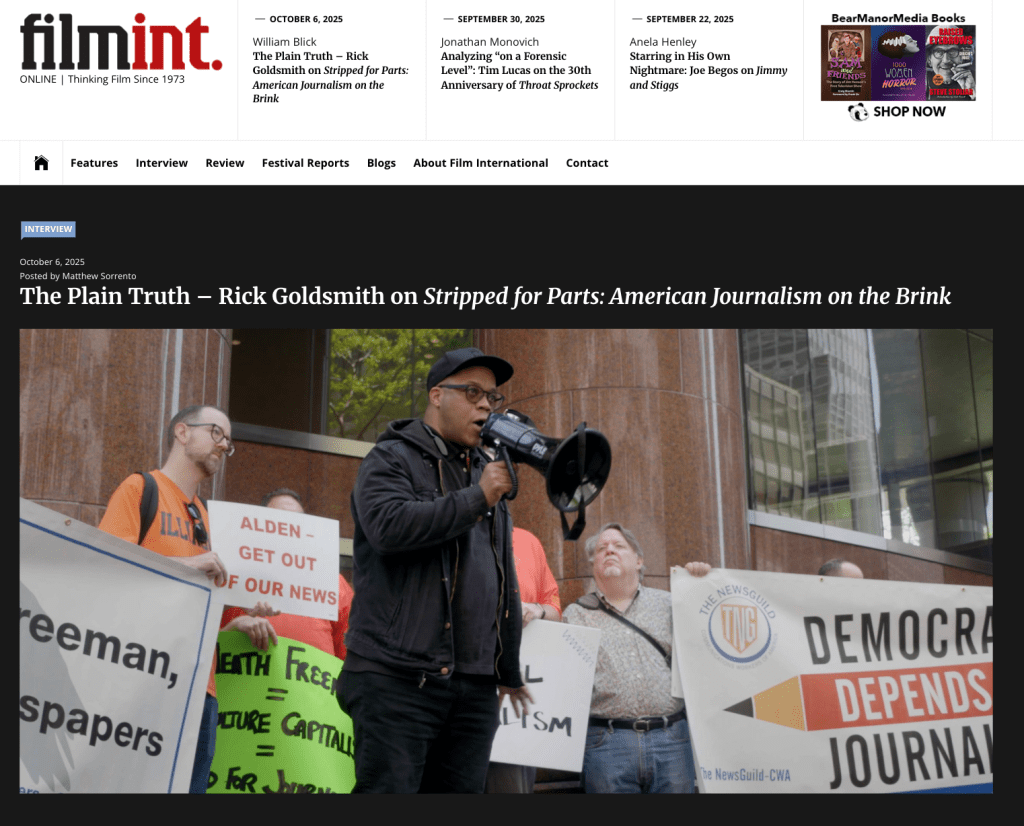 Another review, another interview! This time from Film international. They say “Goldsmith explores this detrimental threat to one of the basic core tenets of American values, freedom of the press, and shows the bravery of people determined to defend the information needs of our communities.”