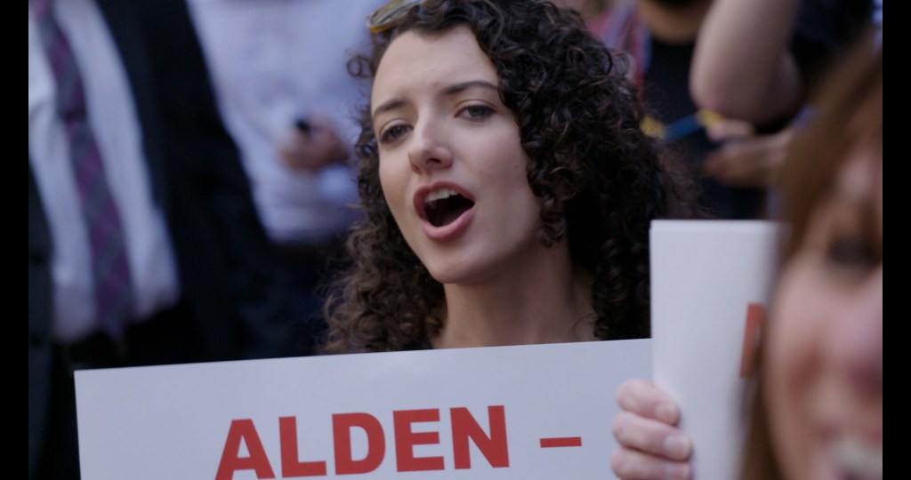 Journalist Elizabeth Hernandez protests outside the NYC headquarters of hedge fund Alden Global Capital in 2018.